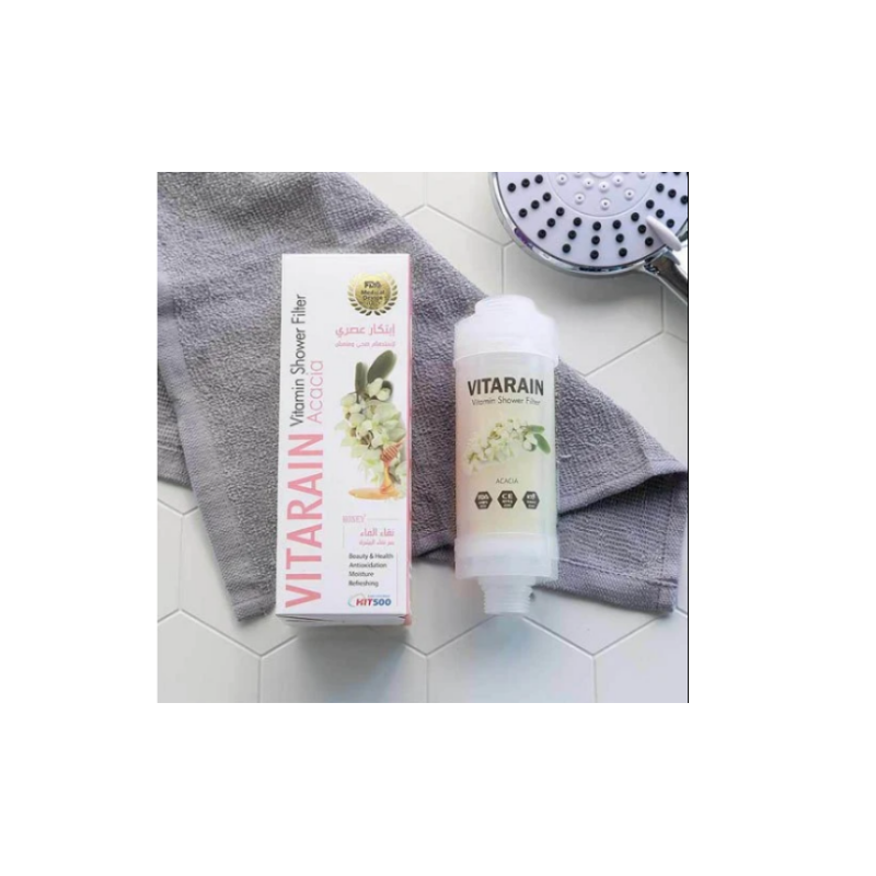 Le filtre de douche Vitarain à l’Acacia permet d’éliminer le chlore et les métaux lourds présents dans l’eau du robinet en y laissant un subtil parfum. Il réduit l’agression des cheveux et de la peau causés par une eau trop dure pour une douche purifiée, un corps & des cheveux sublimés!