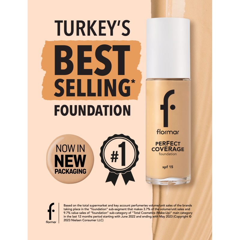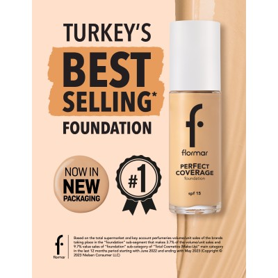 Perfect Coverage Foundation provides a fresh looking make-up up to 12 hours! Having a soft and rich texture, Flormar Perfect Coverage foundation will help your skin look smooth. Thanks to almond oil and olive oil extracts in its formula, a healthy skin awaits you as well! In addition, Perfect Coverage Foundation protects the skin from harmful UV rays with SPF 15 in its formula. Perfect Coverage is suitable for all skin types.